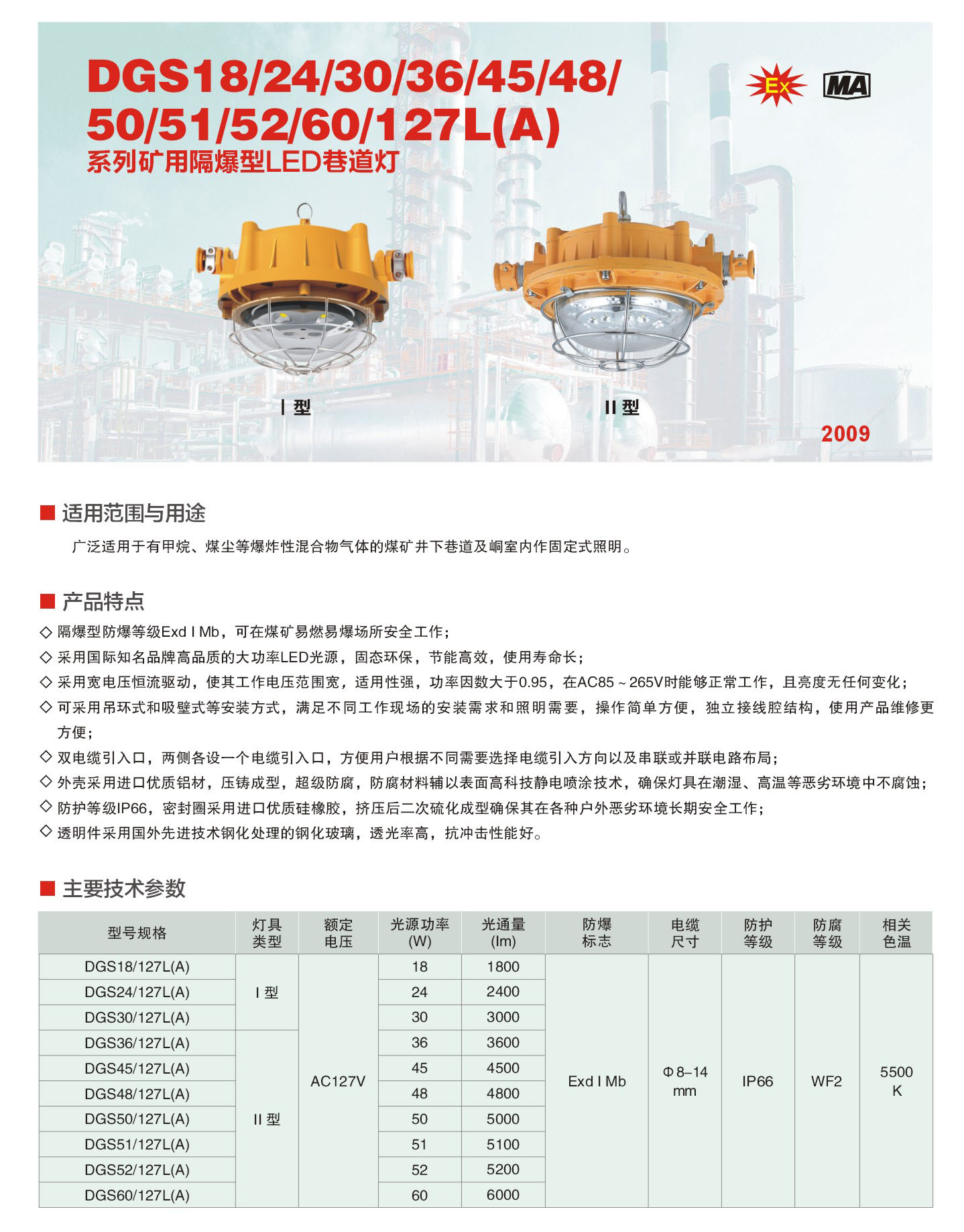 DGS24/28/30/36/40/45/48/50/51/52/60/127L(A)礦用隔爆型LED巷道燈