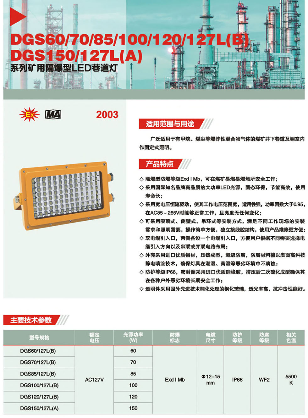 DGS60/70/85/100/120/127L(A)礦用隔爆型LED巷道燈