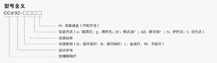 例:如需訂購吊桿式安裝的CCD92防爆照明燈,配用光源無極燈85W時,則訂貨代號為“CCd92-W85g"。